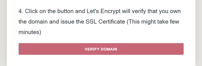 4. Click on the button and Let's Encrypt will verify that you own the domain and issue the SSL Certificate (This might take few minutes)
