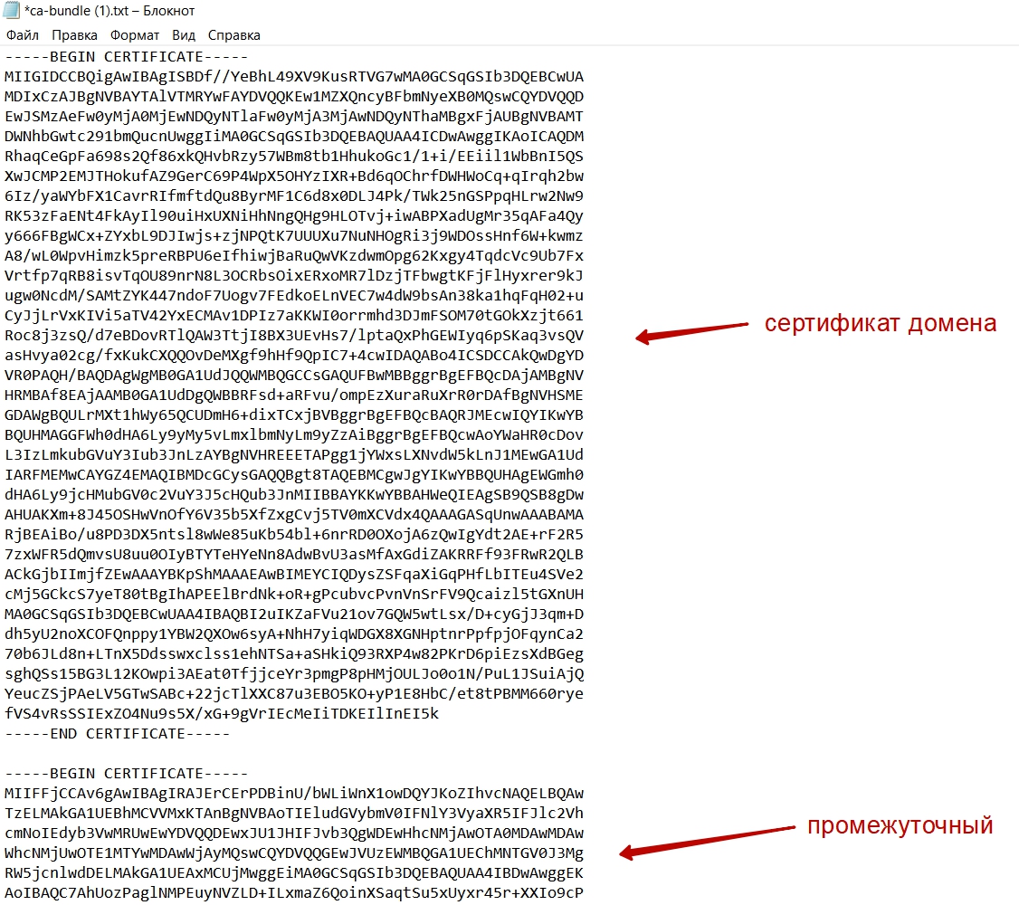 Главное запомнить, что первым в списке идет сертификат домена и далее двойной идет промежуточный.