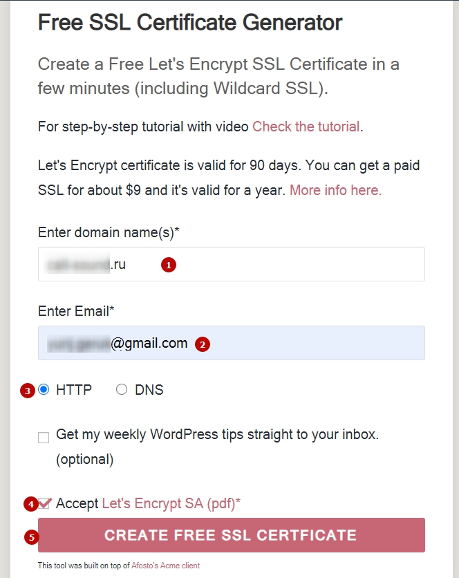 Далее соглашаемся с условиями и отмечаем пункт "Let's Encrypt SA (pdf)*" и жмем кнопку Create free SSL Certficate