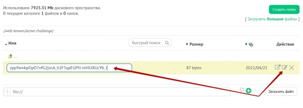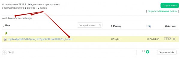 После перейти в файловый менеджер вашего сайта и создать в корне фтп папку с названием well-known, перейти в нее и создать еще одну папку, но уже с названием acme-challenge в нее загружаем скачанный на первом пункте файл.