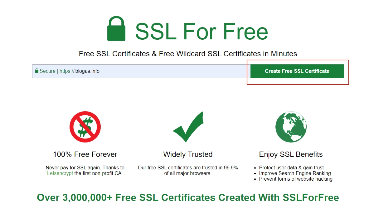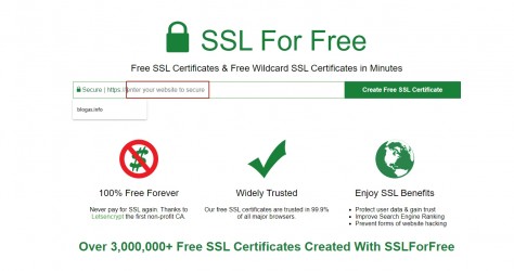 Если вы прошли регистрацию как описано чуть выше, теперь второй и основной шаг, вам нужно перейти на главную сайта https://www.sslforfree.com/ В предложенной строке для ввода, нам нужно вписать ваше доменное имя, подобно sitename.ru без http и без слеша.