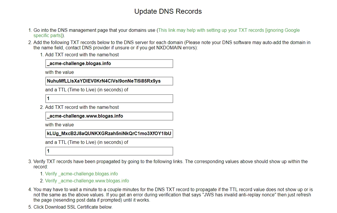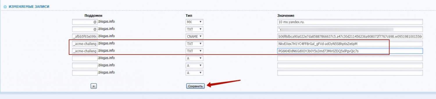 - Если ваш домен не работает по www как и у меня, вам все равно нужно копировать запись www как советуется для прописывания txt записи. Получается, что в первой строке в первое поле нужно прописывать запись (_acme-challenge), в второй строке вида (_acme-challenge.www), остальное, а именно домен автоматически присутствует у каждого поля и его не нужно дублировать.