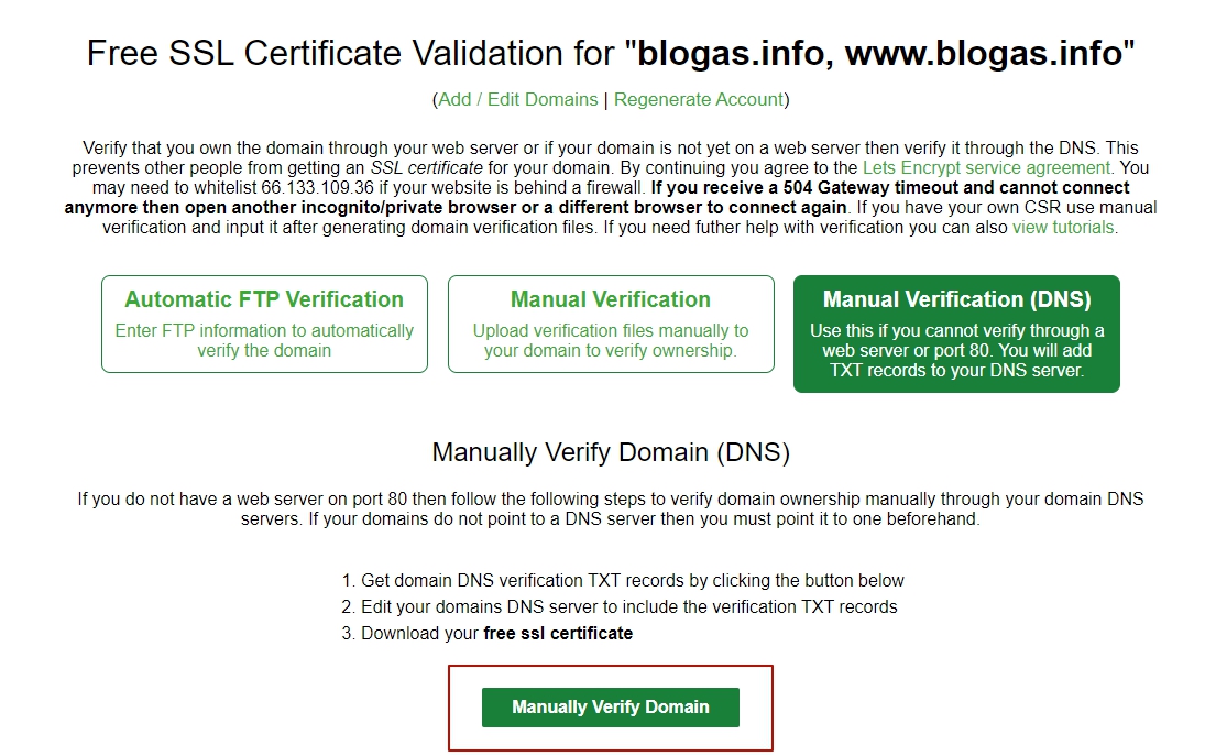 Важно! Основной минус SSL Let's Encrypt, лишь в том, что для подтверждения прав на управление доменом, нам нужно слишком долго ждать обновления DNS. Ждать приходится от 4 часов до 72 в самом худшем случае. Я ждал обновления DNS с 10 часов утра практически до 14 часов дня.