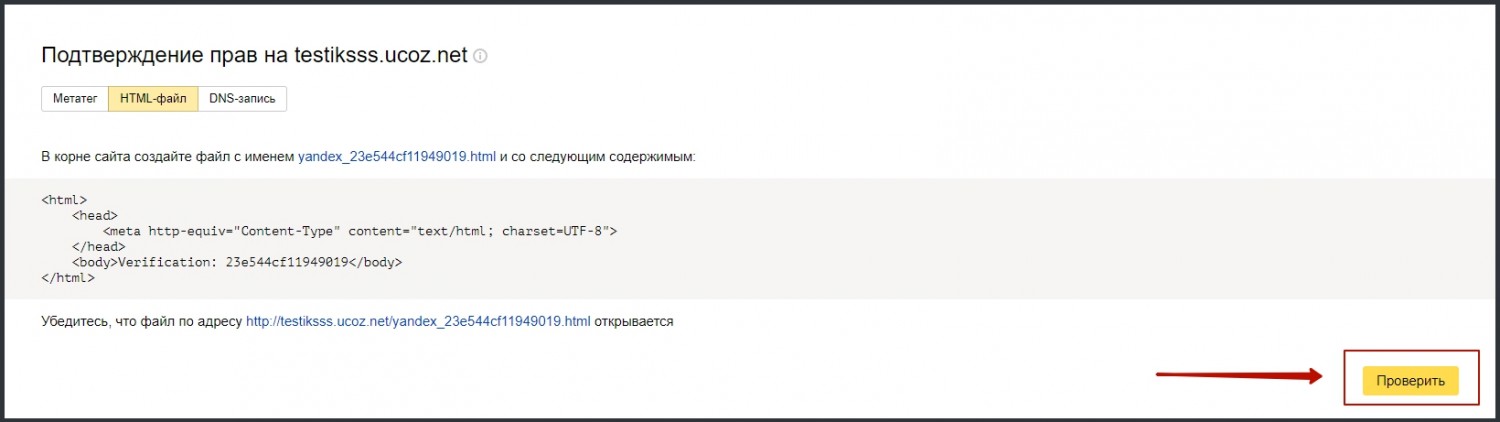 После как нажали кнопку "Добавить", вы увидите новую страницу подтверждения прав на сайт: