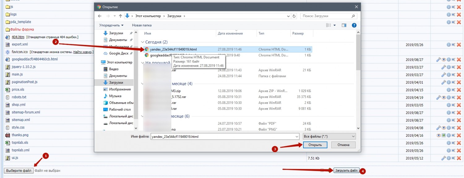 В пункте 1 жмем по ссылке, далее скачается файл для подтверждения прав на сайт. После открываем файловый менеджер вашего сайта ваш-сайт.ucoz.net/panel/?a=fm жмем кнопку "Выбрать файл", выбираем скачанный файл и жмем кнопку "Загрузить файл".