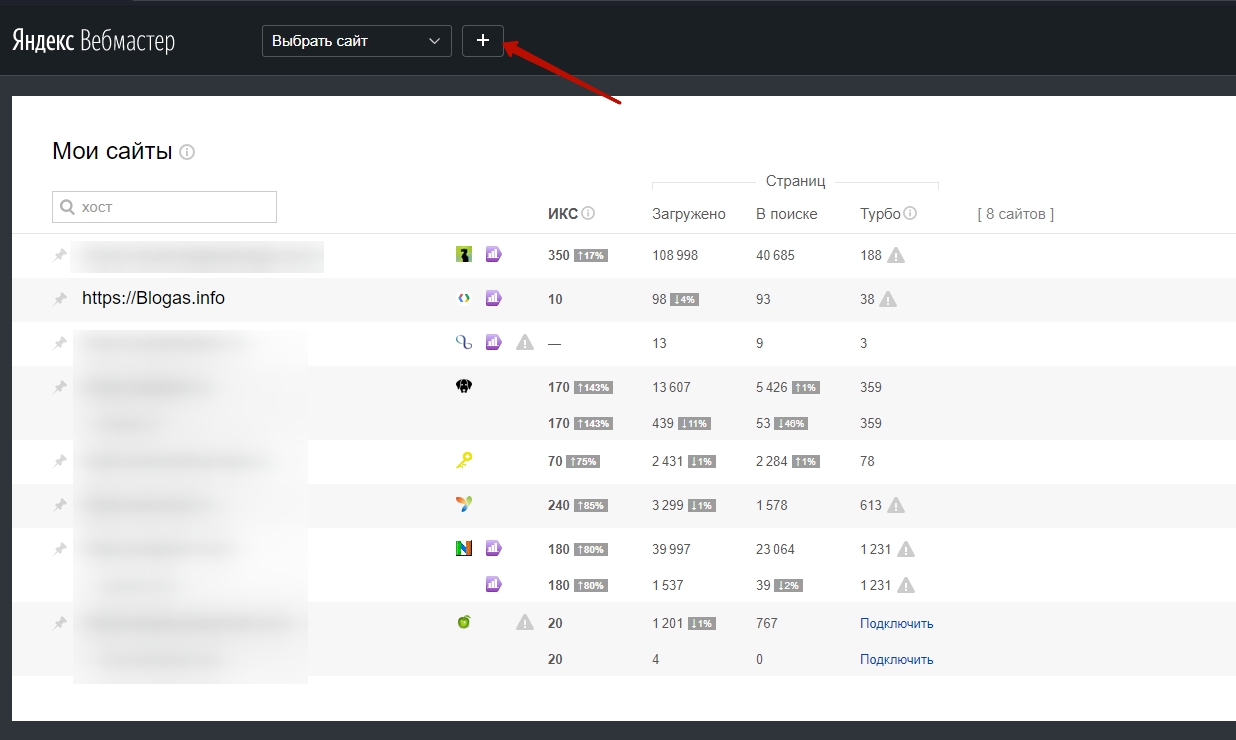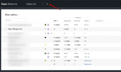Первое что нам нужно сделать, это перейти по адресу https://webmaster.yandex.ru и нажать на иконку "+":