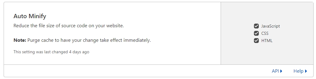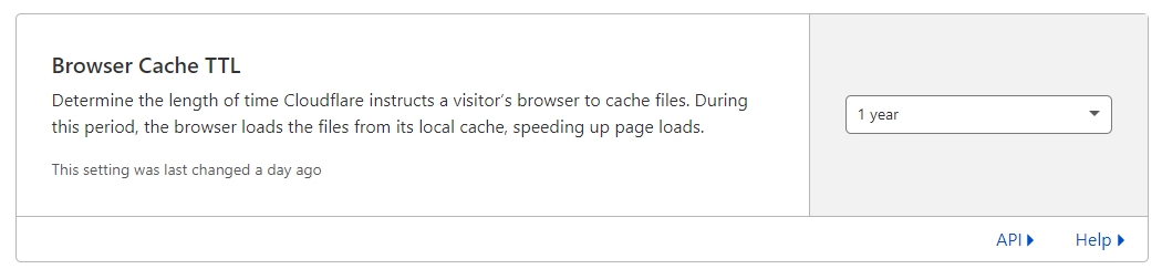 Данной опцией мы настраиваем продолжительность времени, в течение которого Cloudflare предписывает браузеру посетителя кэширование файлов на вашем сайте. В этот период браузер загружает файлы из своего локального кеша, ускоряя загрузку страницы.