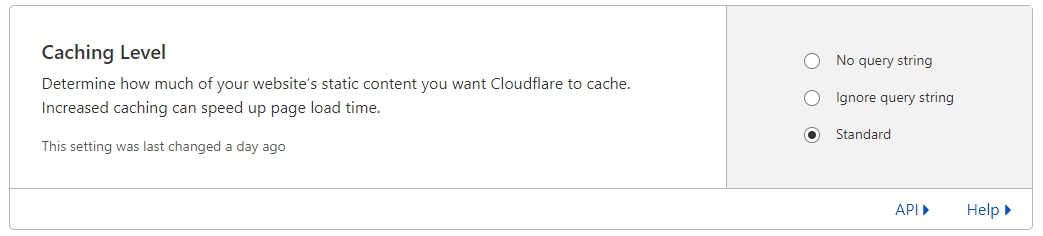В данной опции переключите на пункт "Standard", данная настройка определяет какую часть статического контента вашего сайта вы хотите, чтобы Cloudflare кэшировал. Повышенное кэширование может ускорить загрузку страницы чего мы и добиваемся.