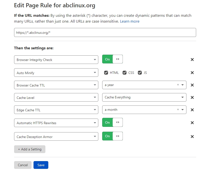 Далее добавьте правили в точности как на изображении в примере выше, для добавления правил просто нажимайте кнопку "+ Add a Setting" по завершению не забудьте нажать кнопку "Save".