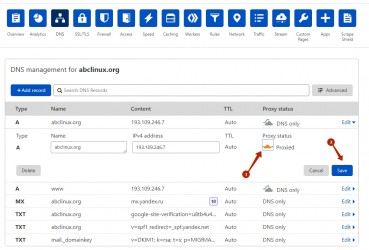 Достаточно нажать по оранжевой иконке и отобразится надпись DNS Only и после нажмите кнопку "Save".