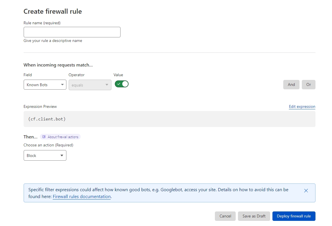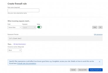 Перейдите в кабинет Cloudflare, выберите свой сайт с списка доступных, далее перейти в раздел Security - WAF, далее выбираем пункт Create firewall rule, и создаем правило для запрета: