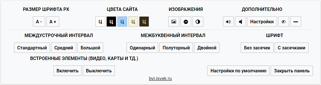 Button visually impaired — это плагин, который автоматически изменяет версию вашего сайта для слабовидящих людей. Панель на сайте для слабовидящих дает возможность изменять цветовую гамму сайта, размеры шрифтов, синтезатор речи озвучит вслух изменения настроек. С помощью неё можно изменять функции сайта, которые удовлетворят потребностями людей с ограниченными возможностями.