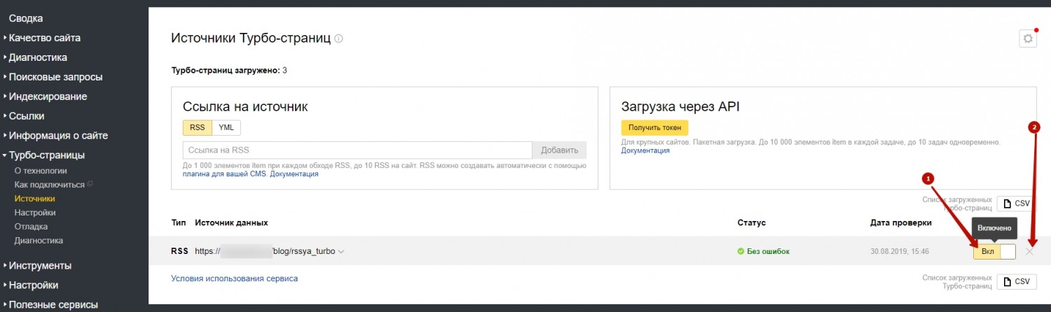 Важно! Первым делом отключить турбо-страницы с панели управления, не спешить сразу удалять RSS фид с вебмастера яндекса в разделе источники, подождите около суток. Это нужно чтобы яндекс увидел изменения связанные с отключением турбо-страниц и обновил данные с своей стороны. Так будет правильно. Если поспешить и сразу же отключить турбо-страницы с панели управления и удалить rss фид с вебмастера, робот может не успеть все проверить и удаление турбо-страниц с выдачи может немного затянуться.