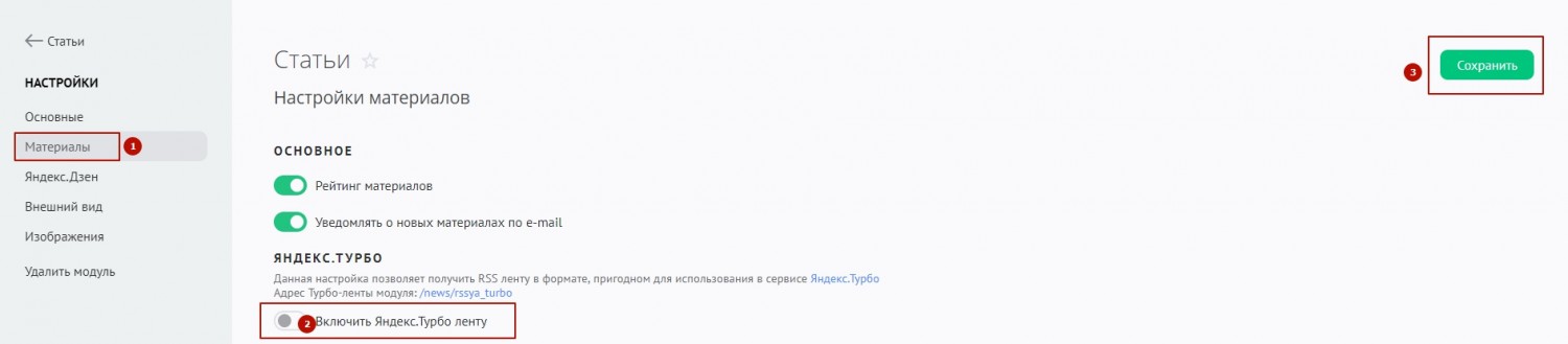 и убираем отметку напротив пункта "Включить Яндекс.Турбо ленту" и жмем кнопку "Сохранить" в правом верхнем уголке. После данных настроек в RSS ленте к блоку item автоматически для всех материалов добавится атрибут (turbo="false") как и требует Яндекс для отключения турбо-страниц.